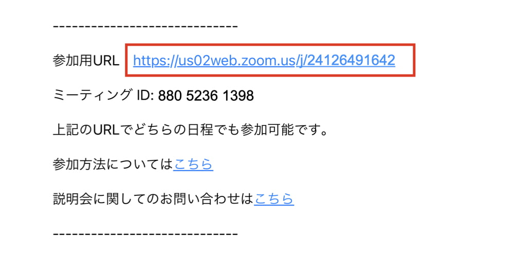 参加用メールに記載のあるURLにアクセスしてください。説明会開始時刻の15分前より入室いただけます。
